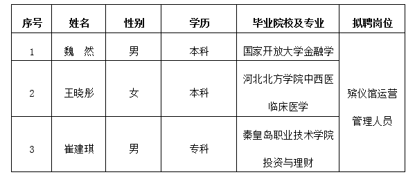 因公司發(fā)展需要,承德市國(guó)瑞置業(yè)有限公司委托第三方機(jī)構(gòu)面向社會(huì)公開招聘殯儀館運(yùn)營(yíng)管理人員3名。現(xiàn)對(duì)擬錄用人員信息進(jìn)行公示,公示期間如有異議,可通過電話、信函等方式反映,反映意見請(qǐng)署真實(shí)姓名。