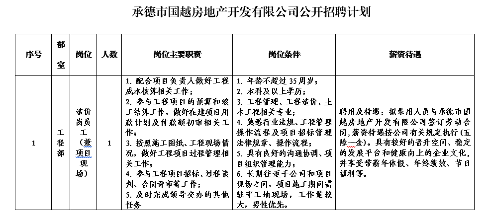本次擬招聘1個崗位共計(jì)1人。具體應(yīng)聘條件見附件《承德市國越房地產(chǎn)開發(fā)有限公司公開招聘計(jì)劃表》 。