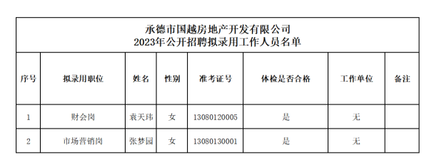 承德市國(guó)越房地產(chǎn)開(kāi)發(fā)有限公司 2023年公開(kāi)招聘擬錄用工作人員公示公告